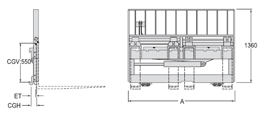 | Capacity 承載能力(kg) | Catalog Order NO 型號(hào) | Mounting Class 安裝等級(jí) | Opening Range貨叉調(diào)距范圍ITO(mm) | Minimum Truck Carriage Width叉車貨叉架寬度最小值(mm) | Overall Width總寬A(mm) | Fock Pocket Width適配貨叉寬度(mm) | Weight 自重(kg) | Effective 失載距ET(mm) | Horizontal Center of Gravity 水平重心CGH(mm) |
